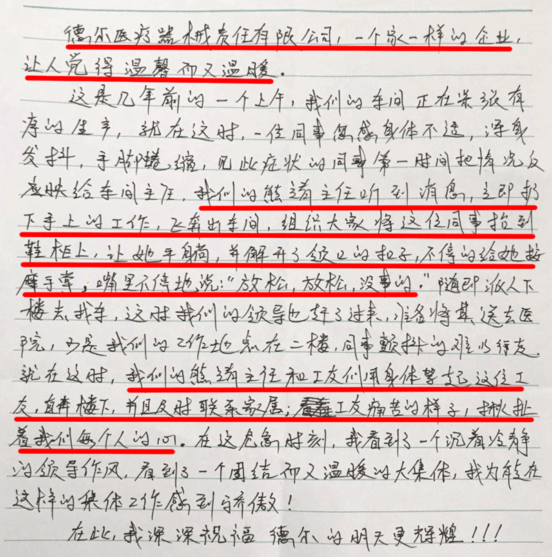 從2016年4月1日加入德爾這個(gè)大家庭起至今,已有四年多了。剛進(jìn)這個(gè)廠什么都不知道,有些產(chǎn)品是干什么用的都不知道。后來,家里人生病住院了,我去探望才發(fā)現(xiàn)他們使用的是我們廠生產(chǎn)的產(chǎn)品,當(dāng)我看到我們的產(chǎn)品的時(shí)候感到很自豪。